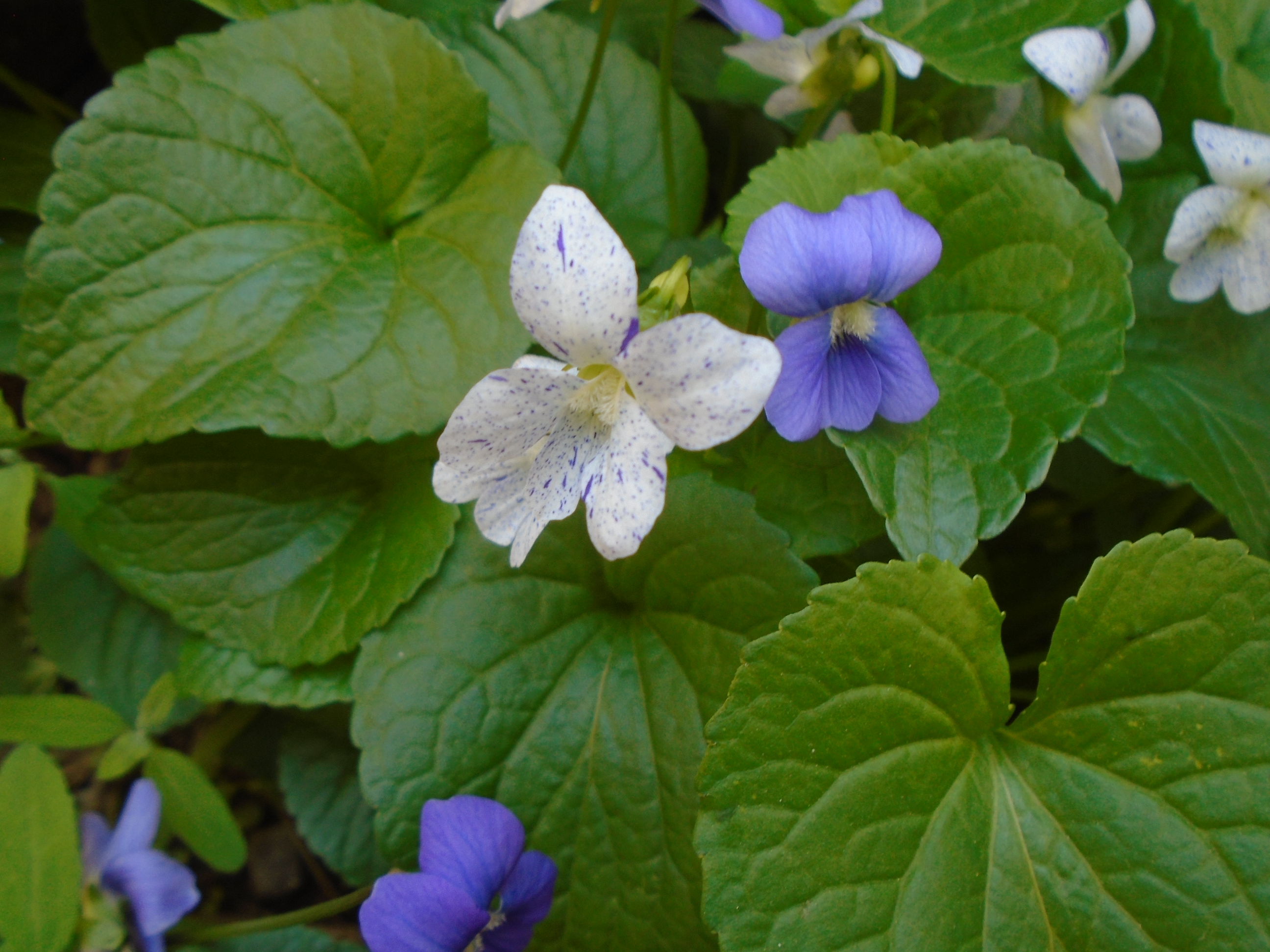 While tending to my yard I came across a patch of spring violets. Not hard to do as they spread like crazy and have taken over most of my backyard. The blue variety are the ones that I planted when I moved into my house many years ago. The white speckled ones seem to be a mutation. Normally I would pull them up but this new color is very pretty.