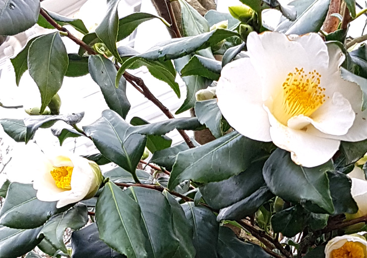 This comes up every year along our road. I have no idea of it's real horticultural name but I refer to it as the Bacon & Egg Camelia. A bit rude as it is a lovely plant and I like Camelia, but it just reminds me.... and delights me as it appears towards the end of Winter so it's a sign that Spring is about to reach us.