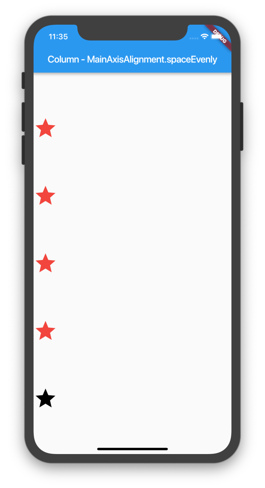 - CrossAxisAlignment.start : 시작지점으로 맞춤, 이후 좌우(Column인 경우) 또는 상하(Row인 경우) 간격을 맞춤