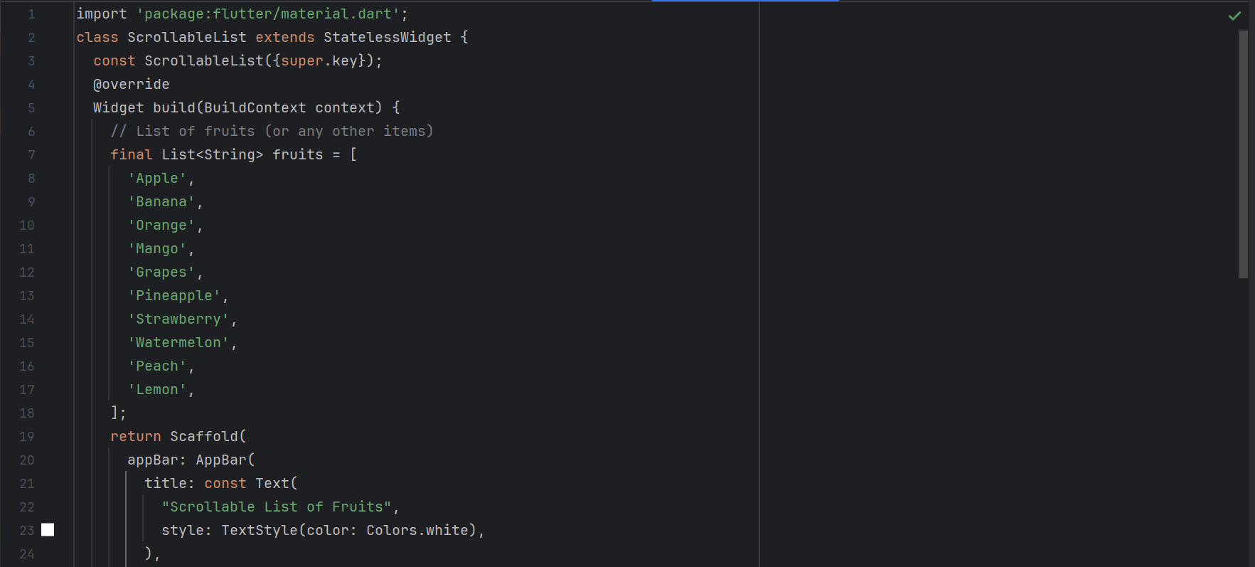 StatelessWidget - Then I have created a list of the fruits. The list contains 10 fruits startig from Apple and ending with Lemon.