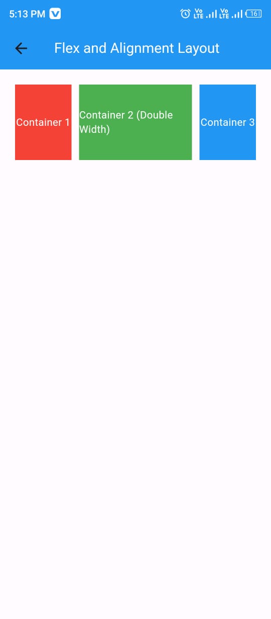 The screen has been divided into 4 parts horizontally. And the first container of red colour and the last container of blue colour is is occupying one part of screen each and the second container of green colour is occupying 2 parts pf the screen.
