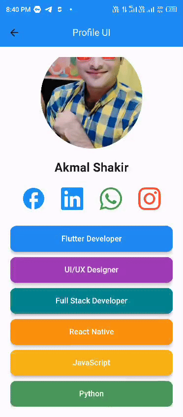Finally the profile UI has been created. It has a profile picture, name of the user, some social links of the user as well as the skills of the user. And one more thing that I have used a NetworkImage to display the image. I have used the link of my steemit profile picture.