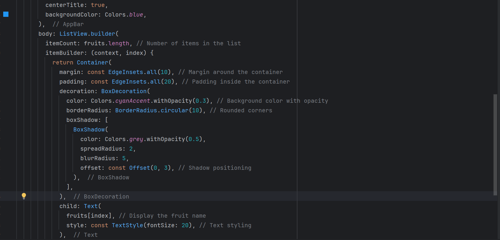 Create a List of Items using ListView. Create a list of strings (e.g., a list of fruits). Display this list in a scrollable ListView. Each item in the list should be displayed as a Text widget inside a Container with padding and margin.