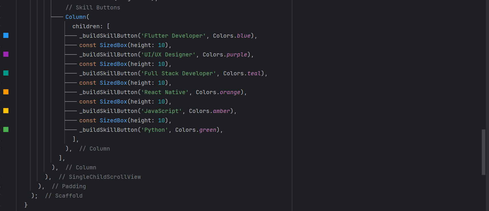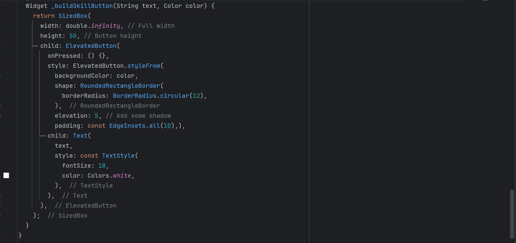 ElevatedButton. I have given some style to the ElevatedButton to look beautiful. - I have used text and colour as a parameter to this widget so that it can be changed dynamically. Because each button requires different text and colour.