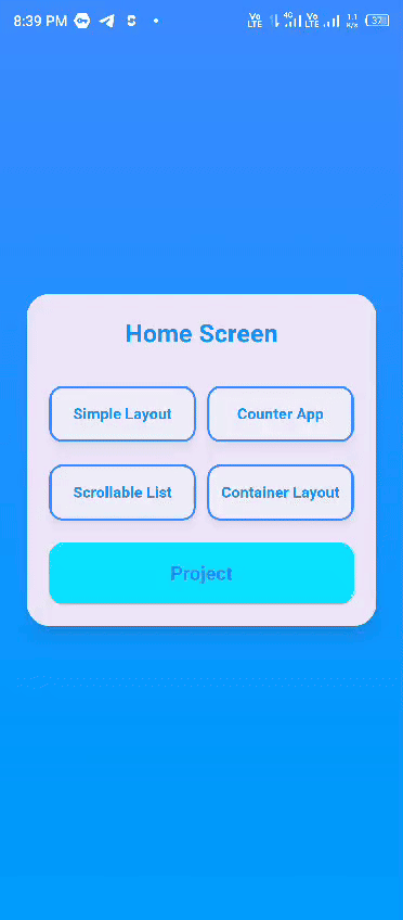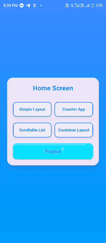 It is the video of all the of the tasks and their outputs. I have merged everything in a single application. The first page is the HomeScreen which has all the necessary data and options to navigate from this screen to other screens. HomeScreen has 5 custom ElevatedButtons such as Simple Layout, Counter App, Scrollable List, Container Layout and Project.