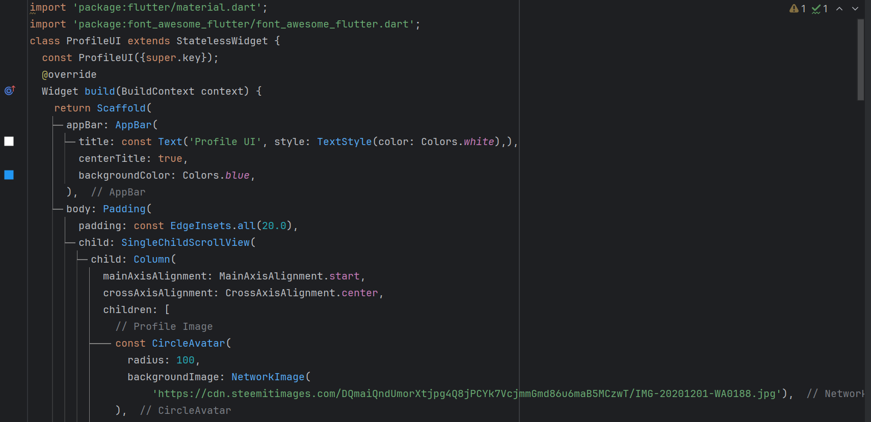 Columnwidget. - Then in order to achieve the first goal of a profile there is the need of a profile picture. As the profile pictures are circular in shape. For the circular profile image I have used `CircleAvatar. It is just a circle and I have used background image to fill it.
