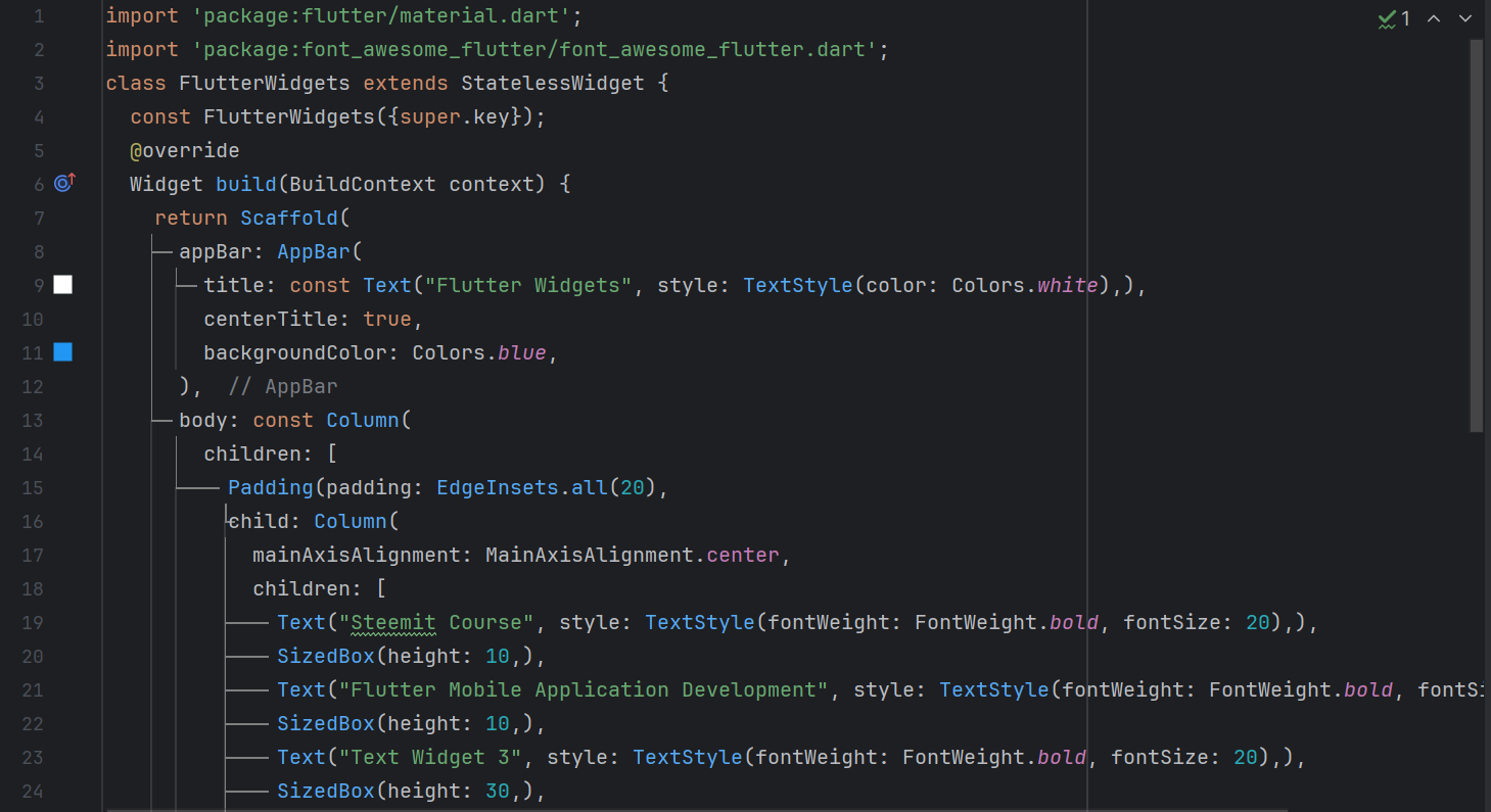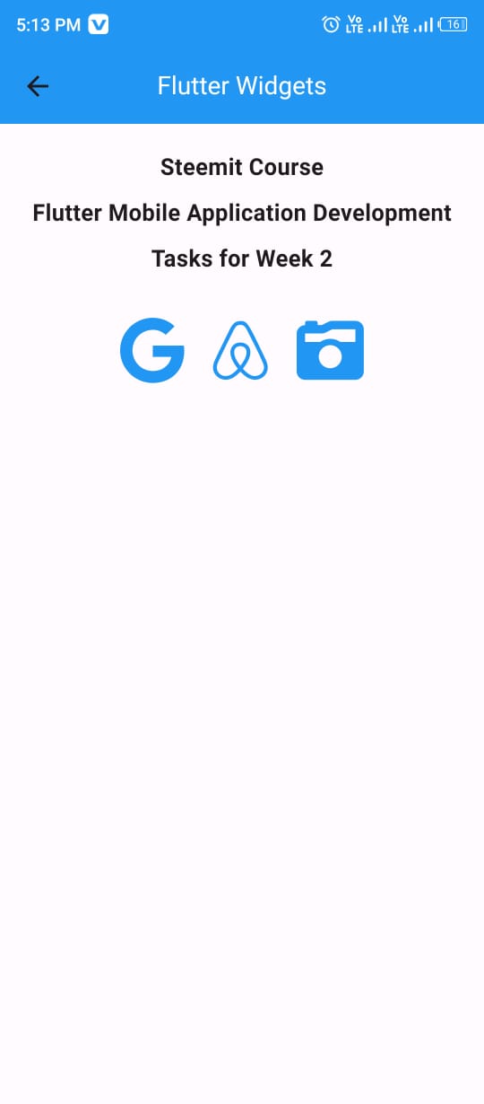I have studied the whole lecture with great attention and care and I have practice different widgets. Here I have created a simple user interface as required by teacher. All the code to create a screen which displays the 3 text widgets vertically and then it displays icons in the row widget horizontally.