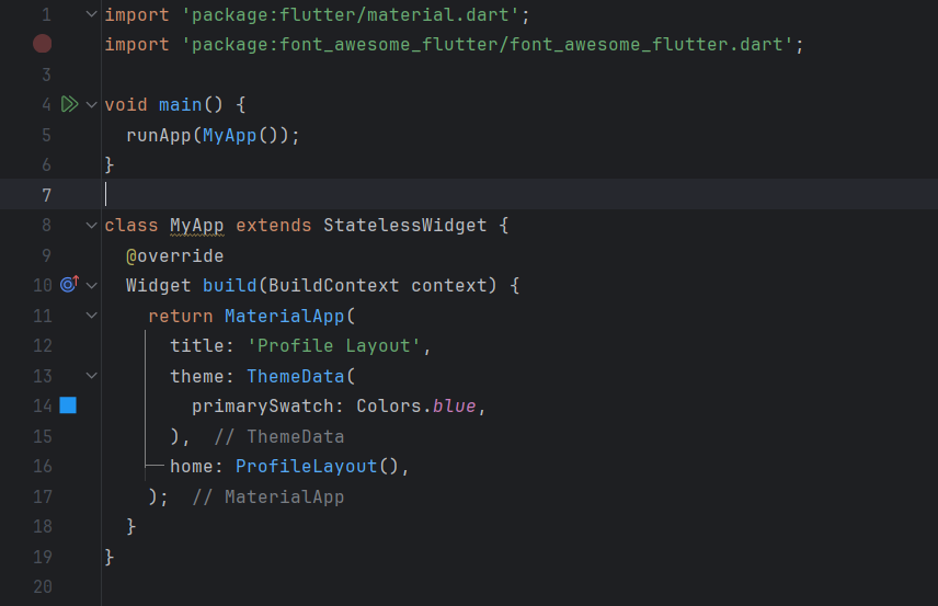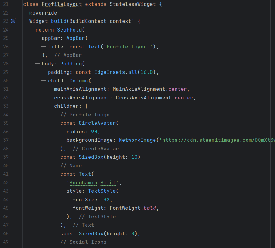 Scaffoldfor the basic structure of the screen, including anAppBarwith the title "Profile Layout".I display a circular profile image (