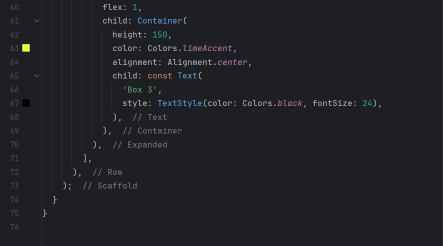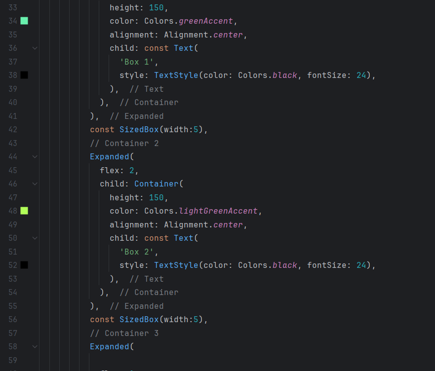 I start by creating a Row that contains the three Containers. To make the Containers take up all the available space horizontally, I surround each of them with the Expanded widget. The flex parameter of Expanded is used to define the proportion of space that each Container should take up. Here, the first and third Containers have a flex of 1, which means that they will share a share of the available space equally. On the other hand, the second Container has a flex of 2, which allows it to take up twice as much space as the others.