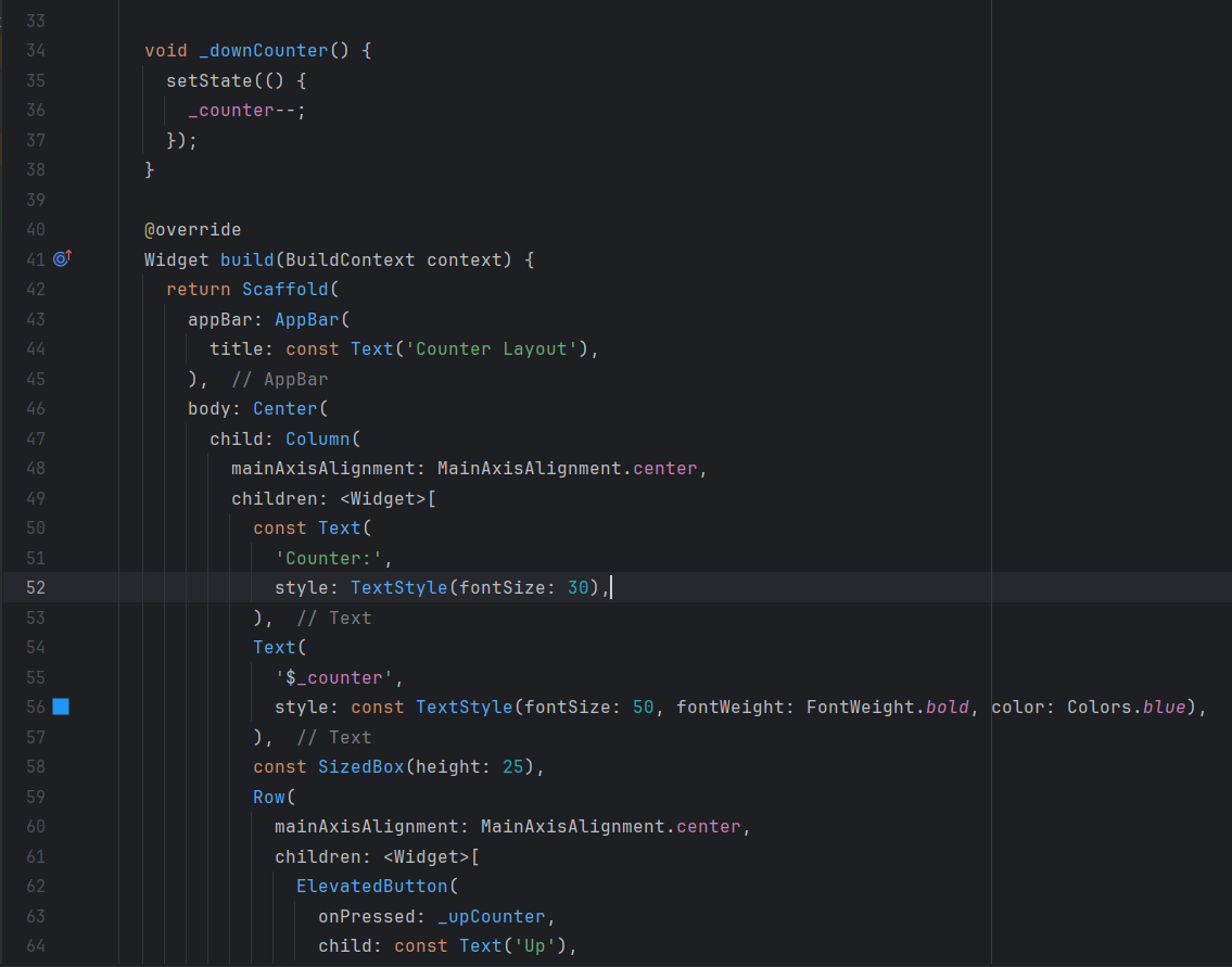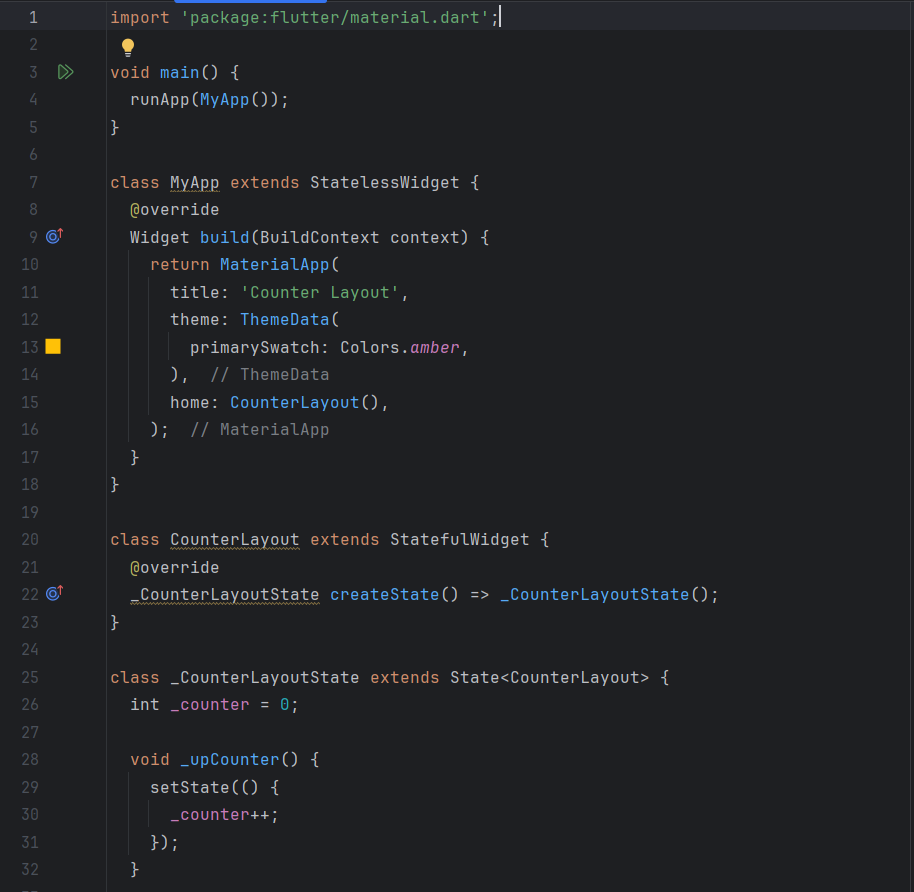 In this code, I build an application that displays a counter with two buttons to increment and decrement it. I start by creating a StatefulWidget that allows me to update the interface based on the state.