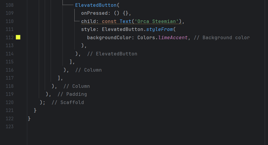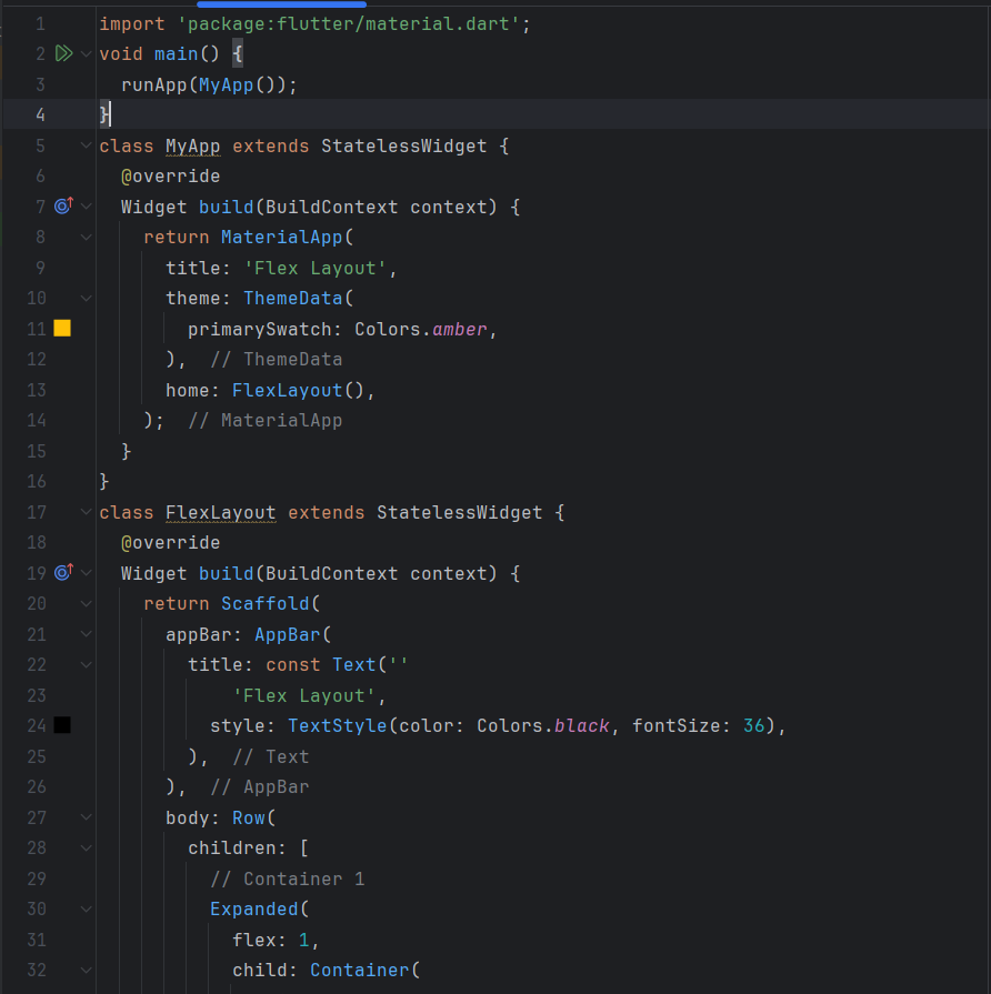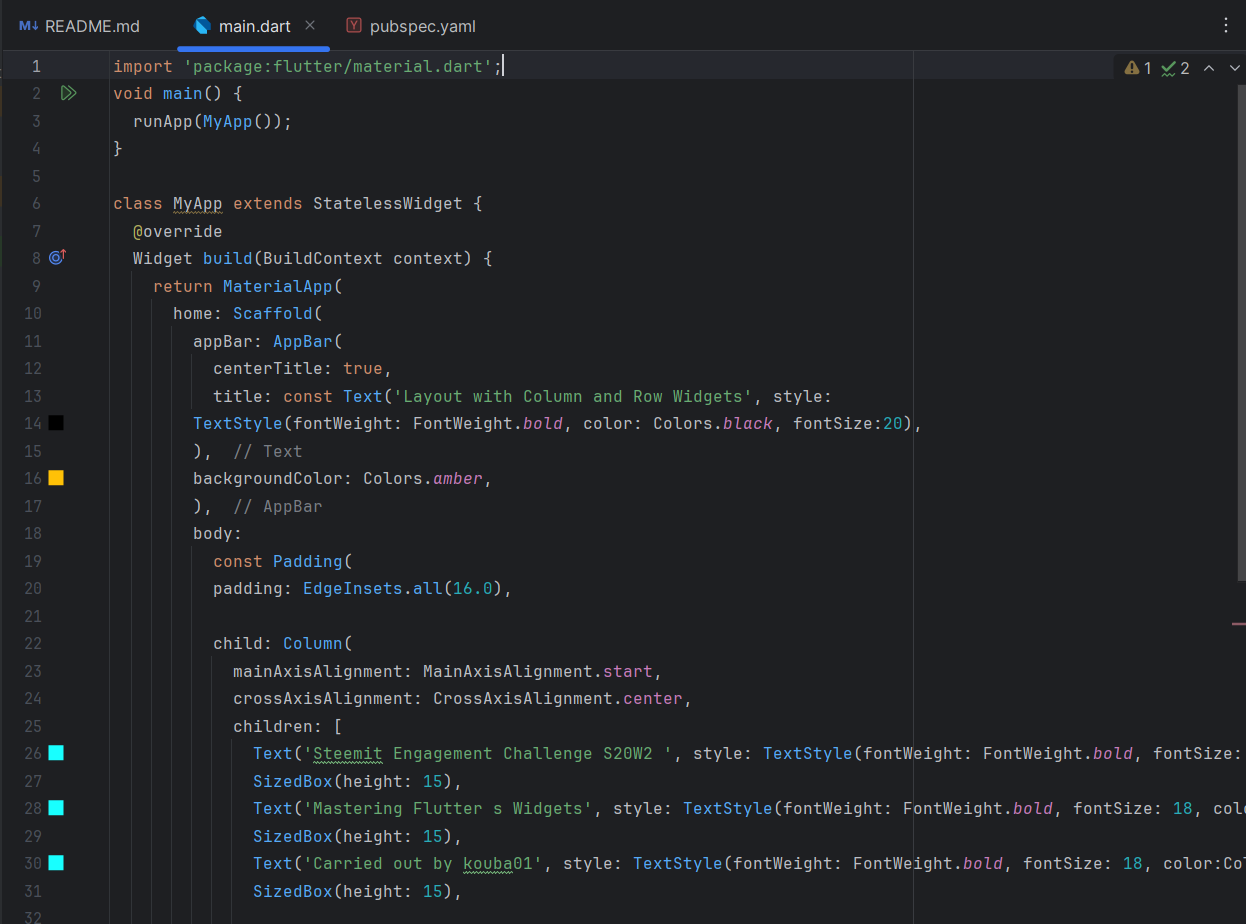 In this code, I create a simple Flutter app with an interface that uses Column and Row widgets. I start by defining a MyApp class that extends StatelessWidget. Then, I set up the basic structure with a Scaffold, which includes an app bar (AppBar) and a body (body).