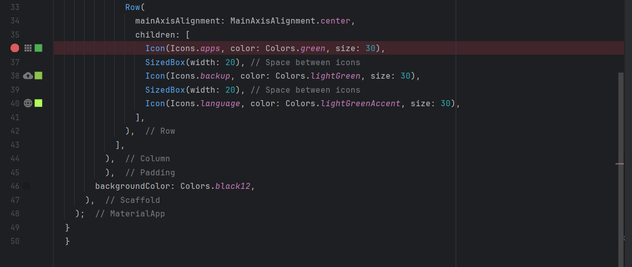 Inside this column, I also place a Row widget that contains three icons aligned horizontally. To organize these icons and make the interface more airy, I also add SizedBoxs between the icons, to create horizontal space.