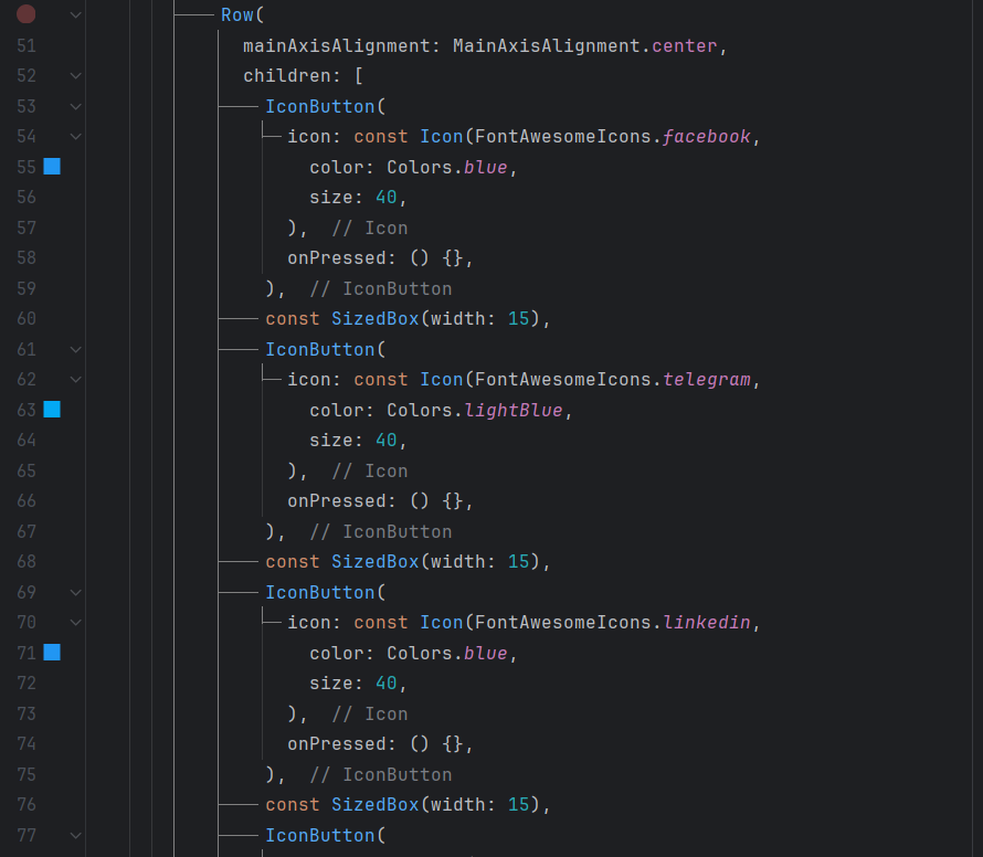 Row). The icons include Facebook, Telegram, LinkedIn, and Twitter. I useIconButtonto make each icon clickable, with a color corresponding to each social network. I separate them with spaces (SizedBox).I create a column (