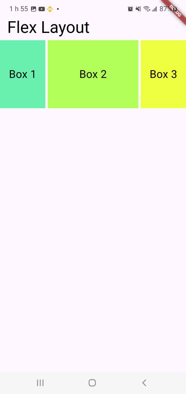 To explore flexibility and alignment in a responsive UI with Flutter, I designed a layout with three Container widgets displayed inline. To do this, I use the Expanded widget so that each Container takes up a specific proportion of the available space in the row.