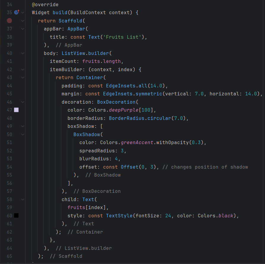 ListView.builderto display the list of fruits efficiently and effectively. This method is particularly suitable for long lists because it builds the items on demand.For each item in the list, I use a