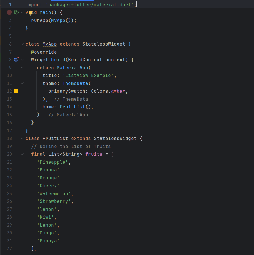In this code, I create a UI to display a list of fruits using Flutter. Here is a description of my work: