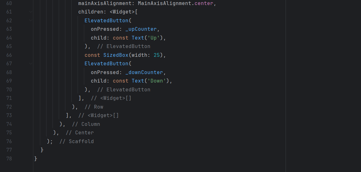 I define an initial state where the counter is set to a value (for example, 0) and I display it in the center of the screen. For this, I use a Center widget with a Text to display the value of the counter.