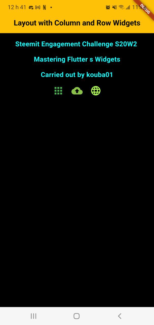 Task1: Create a Simple Layout with Column and Row Widgets. Create a simple UI that displays three text widgets vertically using a Column. Inside one of the Column children, add a Row that contains three icons aligned horizontally. Add some space between the text widgets using SizedBox.