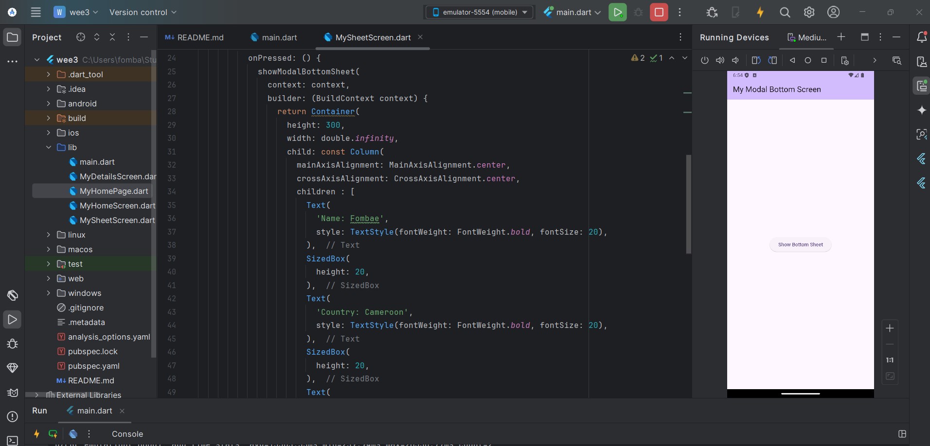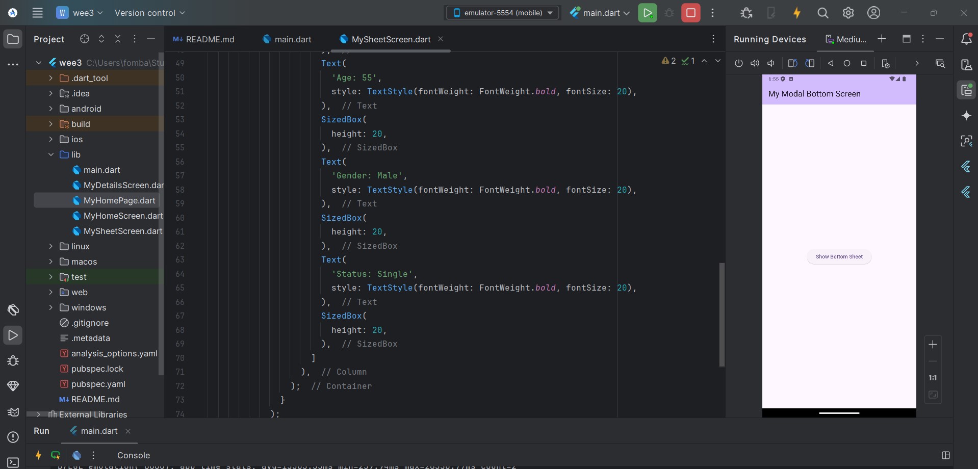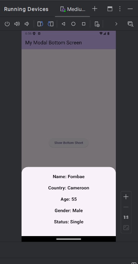 Implement a bottom sheet pop up. On the screen add a button to navigate from that screen to the bottom sheet. And add some data to display on the bottom sheet such as name, country, age, gender, etc.