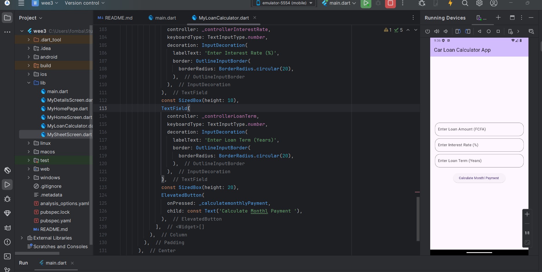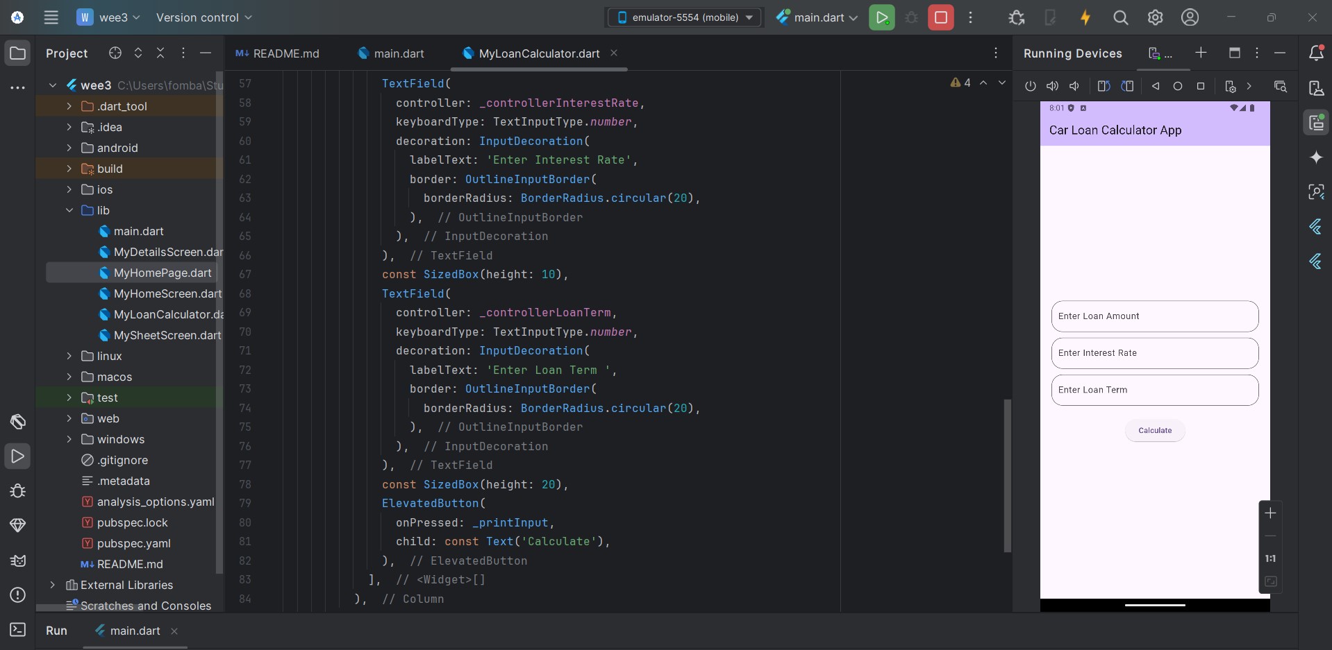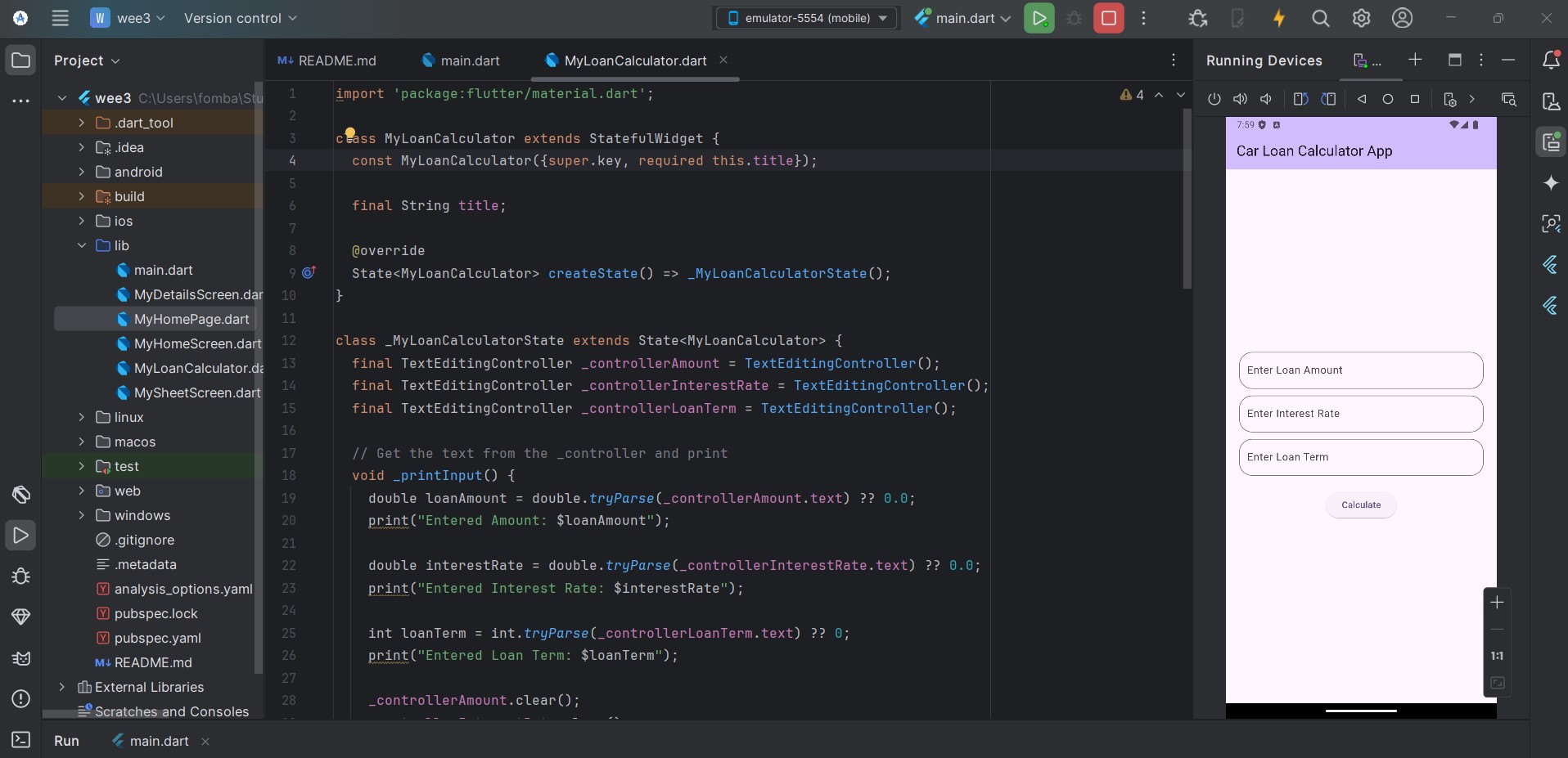 Let's start with creating the input field for the user to insert the load amount, interest rate, and load term. At the same time, we create the textEditingController to hold the input from the text field. At this point, we can print out input on the console.