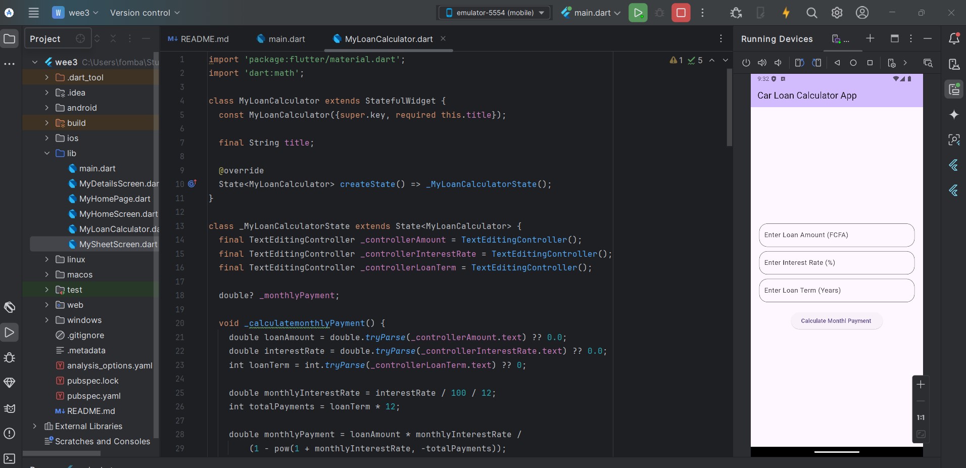 Now, I move to logic, which is the core of the application. We need the formula to calculate Monthly payments. To be able to calculate the number raised to a power, I needed to import the 'dart:math'; package to handle exponentiation.