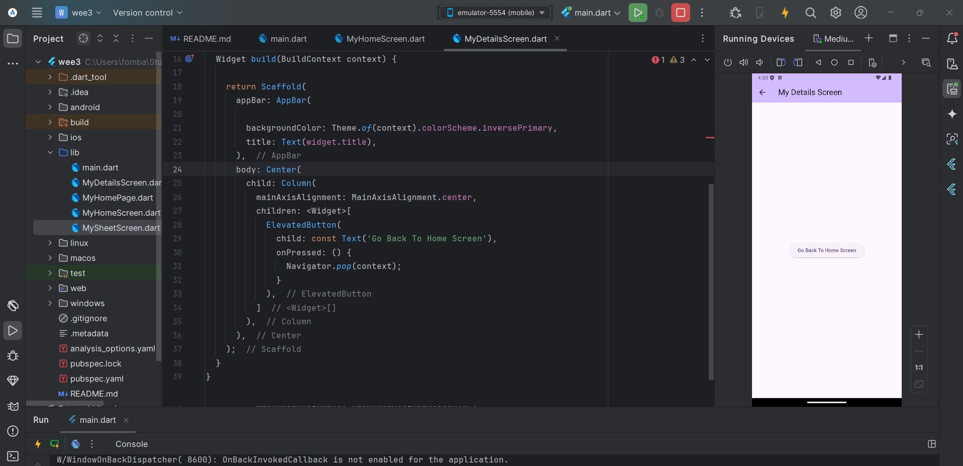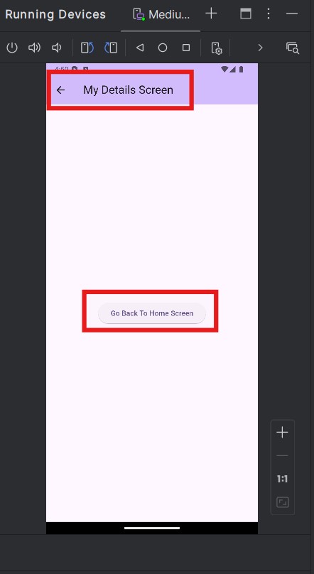 On the MyDetailsScreen file, the only change we have on the ElevatedButton is with the Navigator. It has changed from push to pop and doesn't hold any MaterialPageRoute widget.