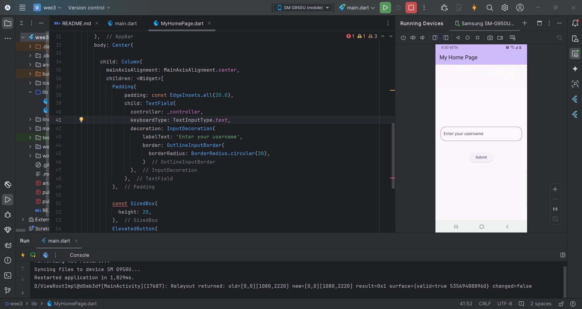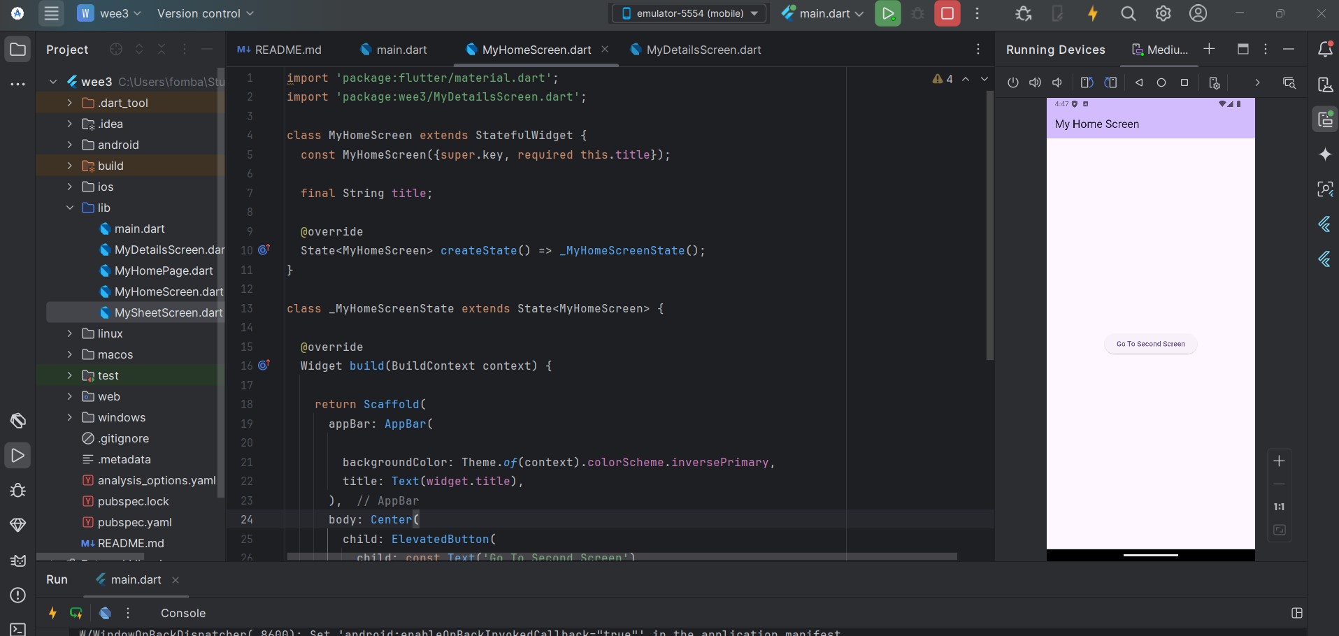 In the MyHomeScreen file, I make use of the ElevatedButton Widget with the Navigator.push.