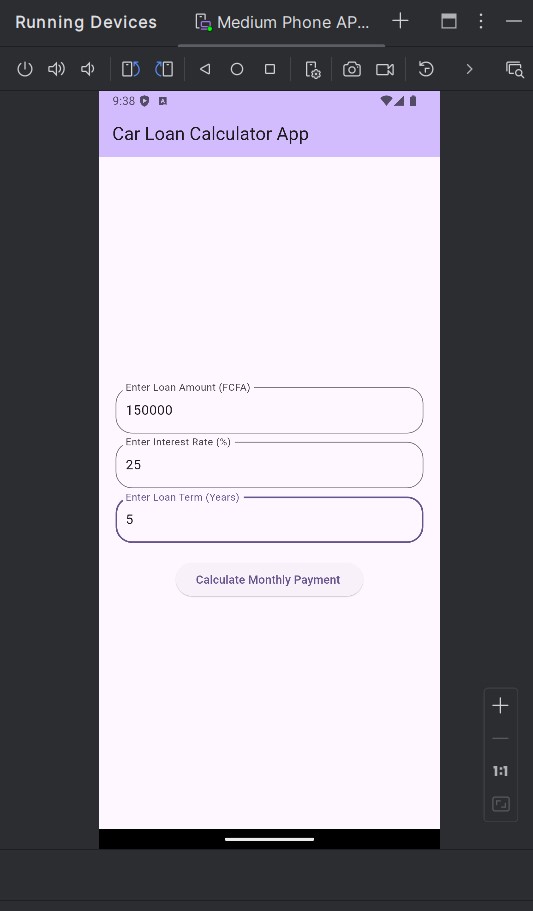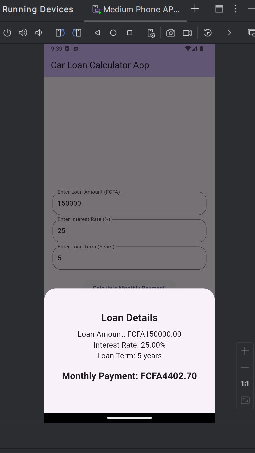 Develop a simple car loan calculator app where users can input loan details (like the loan amount, interest rate, and loan term) and view the calculated monthly payment on a bottom sheet. The bottom sheet should include the loan amount, interest rate, loan term, and the calculated monthly payment.