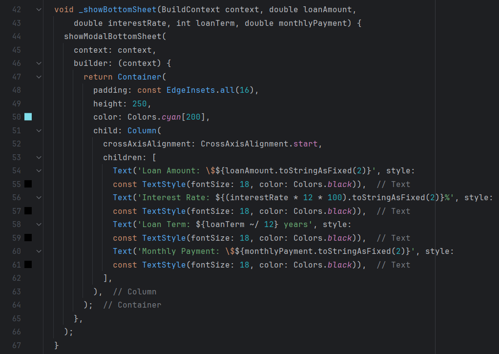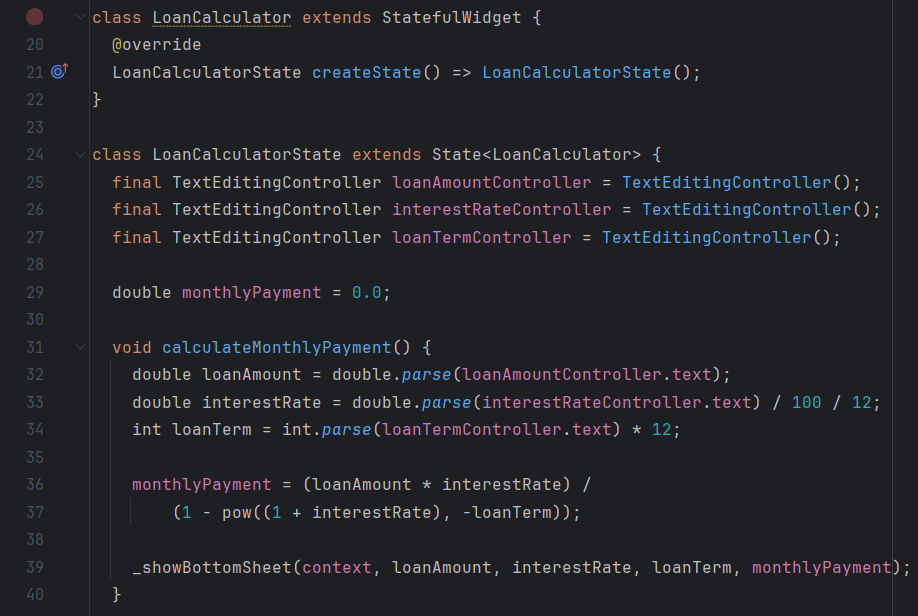 When the user presses the "Monthly Payment" button, the calculateMonthlyPayment function is called. This function takes the entered values, performs the calculations to determine the monthly payment using the classic loan formula, and then displays the results in a bottom sheet using the _showBottomSheet function.