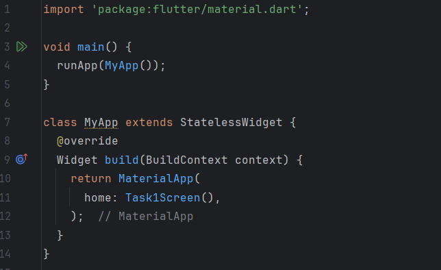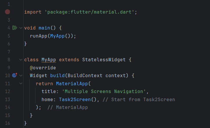 In the main file, I use the runApp() function to start the app and set Task2Screen as the home screen. In this screen, I display a button in the center of the screen with the label "Go to Details Screen". Pressing this button navigates me to the DetailsScreen screen using MaterialPageRoute to handle the transition.