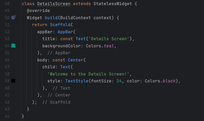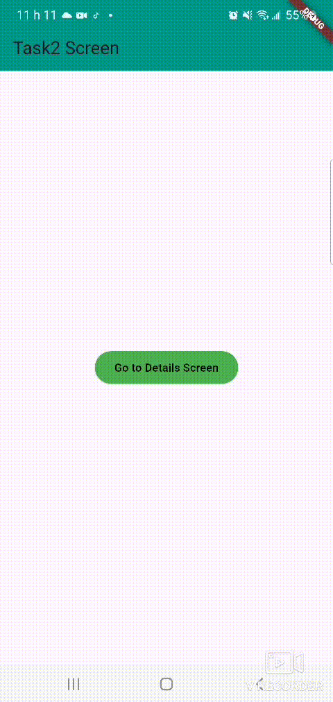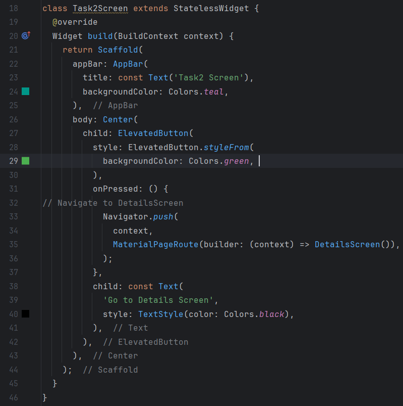 I am building a Flutter app with two screens, Task2Screen and DetailsScreen. The app starts with the Task2Screen screen, where I present a button. When I press this button, the app uses Navigator.push to switch to the DetailsScreen screen.