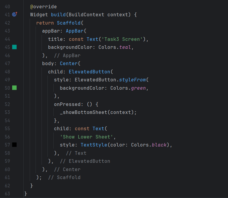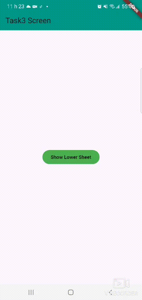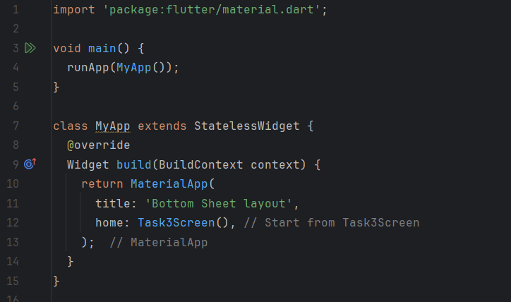 In the main file, I call runApp() to start the app and use Task3Screen as the home screen. In this screen, I add a button with the label "Show Lower Sheet". When this button is pressed, I call the _showBottomSheet() method which triggers the display of the bottom sheet using showModalBottomSheet.