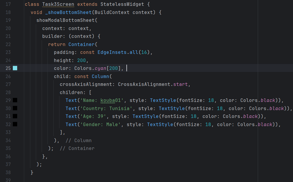 I am building a Flutter app with a bottom sheet feature. The app starts with the Task3Screen screen, where I place a button in the center of the screen. When I press this button, a bottom sheet is displayed from the bottom of the screen, displaying information like name, country, age, and gender.