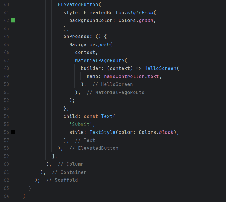 On this second screen, I display the name entered from the first screen in a Text widget by passing it as a parameter to the HelloScreen constructor. Both screens use Scaffold to structure the interface, with an AppBar at the top of each screen to display a title. The button on the first screen is configured to capture the value of the text field and pass it to the second screen when the user presses it.
