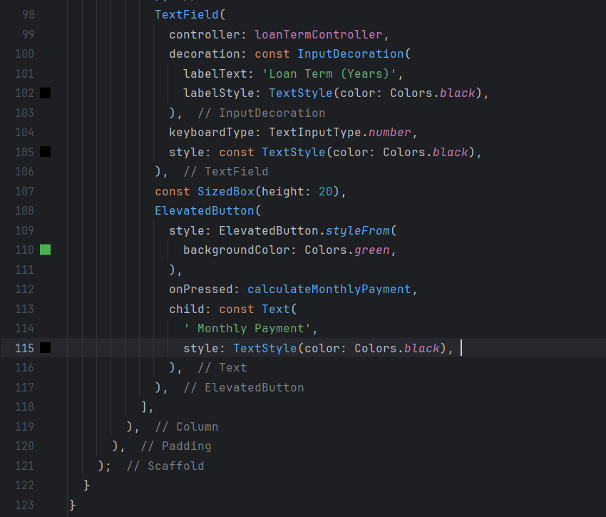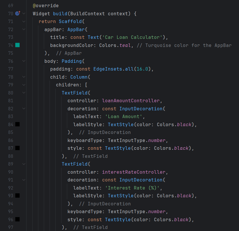 In the main CarLoanCalculator class, I use MaterialApp to structure the app and set LoanCalculator as the home screen. The LoanCalculator screen is a StatefulWidget that allows the user to enter the loan amount, interest rate, and loan term in years via three text fields controlled by TextEditingController instances.