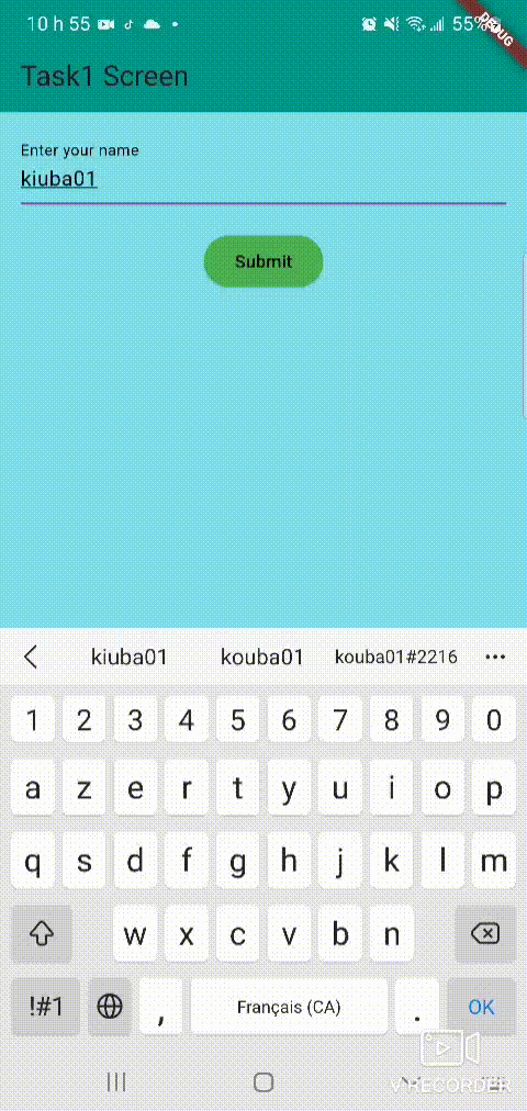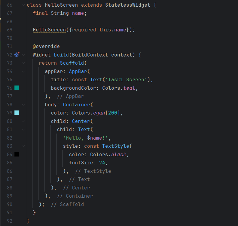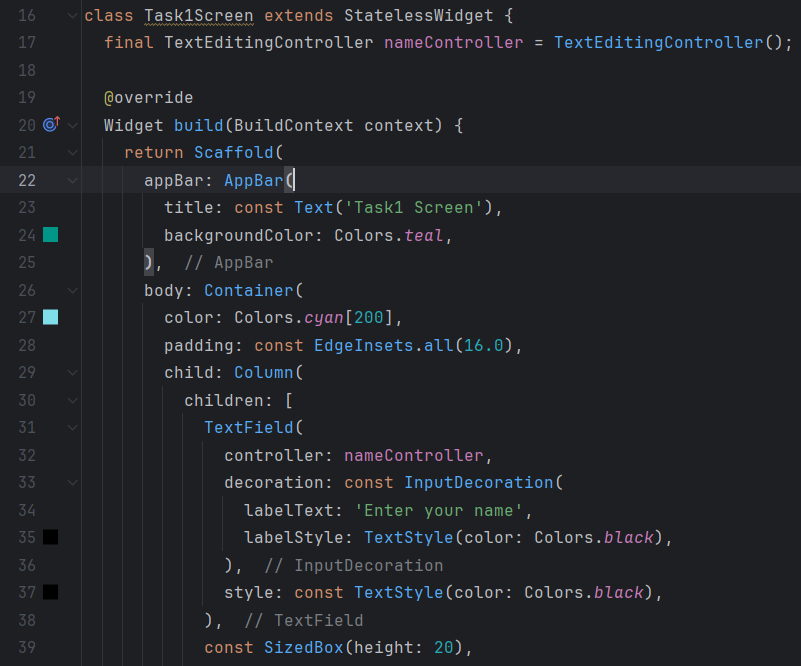 I'm building a Flutter app with two screens using widgets like TextField, ElevatedButton, Navigator.push, Scaffold, and AppBar. On the home screen called Task1Screen, I use a TextField to let the user enter a name, which I control using a TextEditingController. Then, I add an ElevatedButton that, when pressed, uses Navigator.push to navigate to a second screen called HelloScreen.