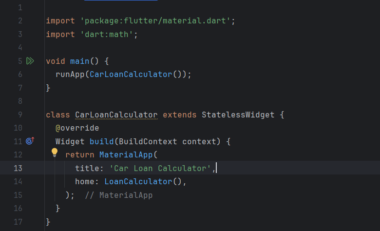 I am building a Flutter app called "Car Loan Calculator", which allows the user to calculate the monthly payments of a car loan. The app starts with importing the Flutter and Dart Math libraries for calculations.