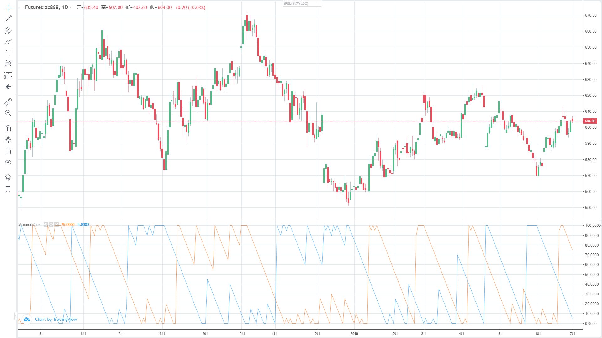 From this formula, we can roughly see the idea of the Aroon indicator. That is: how many cycles there are, and the price is below the recent high/low, helping to predict whether the current trend will continue and measuring the strength of the current trend. If we classify this indicator, it is obvious that it belongs to the trend tracking type. But unlike other trend-tracking metrics, it pays more attention to time than price.