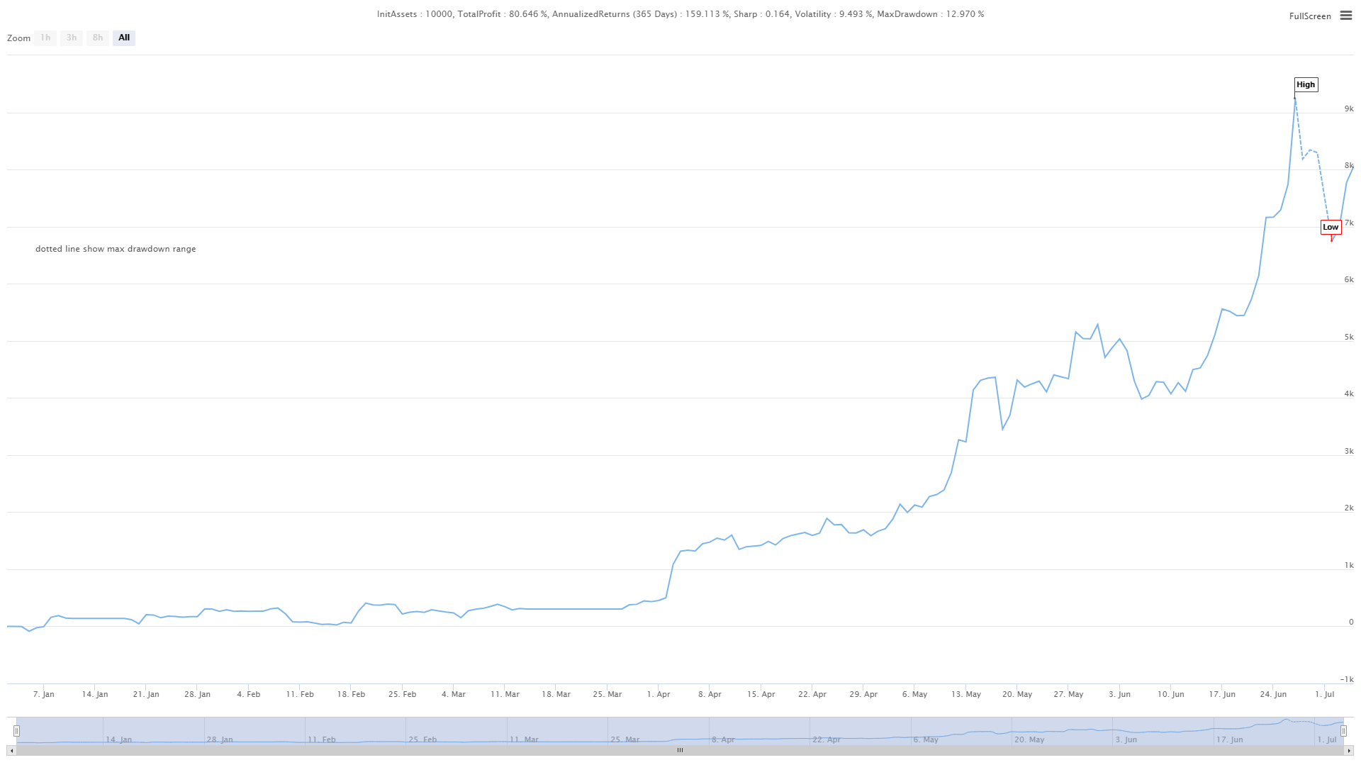From the above backtest results, the strategy is very good when the market trend is smooth, whether in the rise or fall, the Aroon indicator can completely track the market. The capital curve also showed an overall upward trend, and there was no significant retracement. However, in the volatile market, especially in the continuous shock market, there was a partial retracement.
