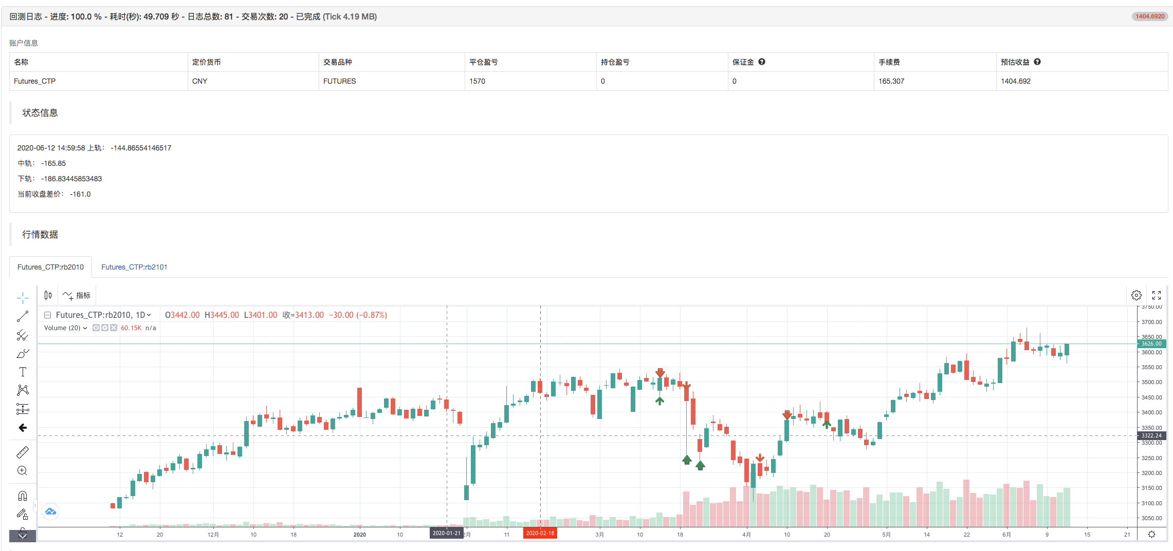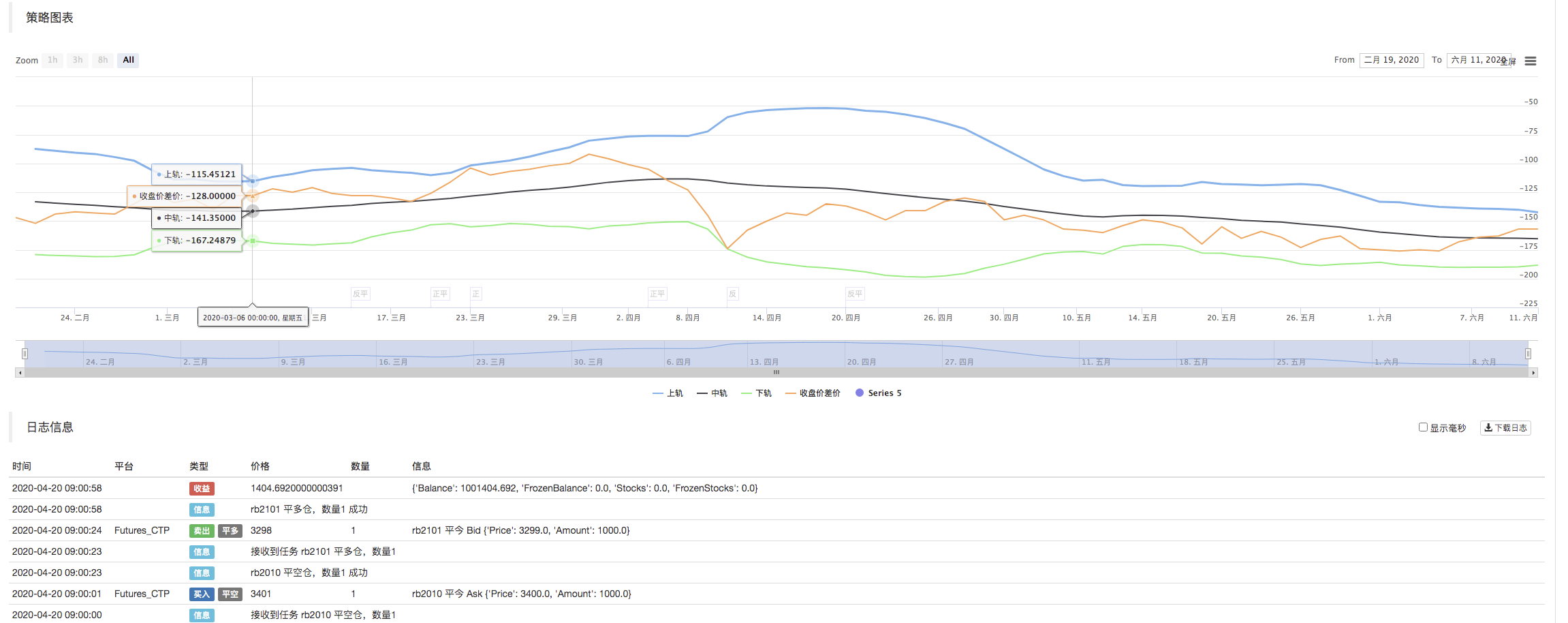 LogStatus(_D(), "upper trail:", boll[0][-1], "\n", "middle trail:", boll[1][-1], "\n", "lower trail:", boll[2][-1], "\n", "Current closing price spread:", arrDiff[-1])