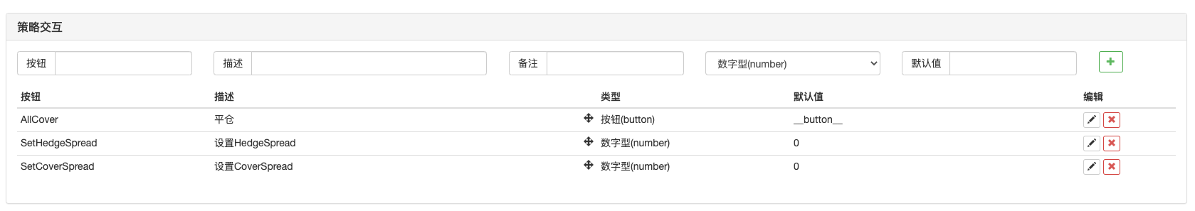 Next, we will add interactive functions, so that the strategy can modify the HedgeSpread and CoverSpread parameters at runtime to control the hedging spread and closing spread. You also need a button to close the position with one click. We add these controls on the strategy editing page.