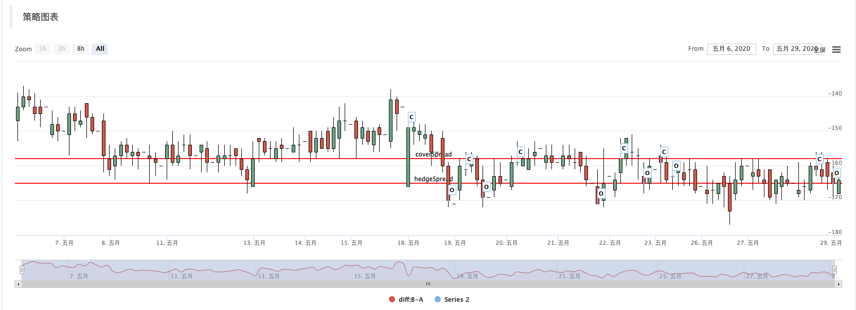 Add the following code before the position where the LogStatus function is called to make the real-time price difference into a K-line statistics. self.preBarTime is a member added by the Hedge class to record the latest BAR timestamp. For drawing, we use "Drawing Class library", directly call the drawing interface, you can easily draw charts.