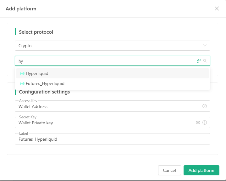 On the Add platform page of the FMZ platform, you can configure Hyperliquid spot and futures exchange objects: