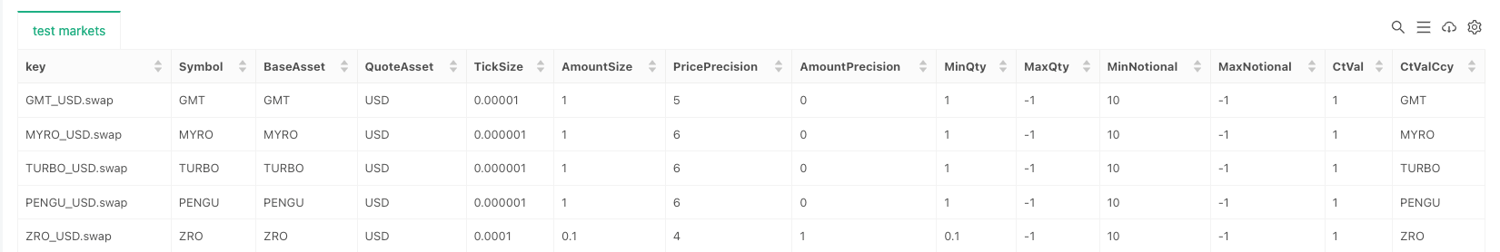 "key", "Symbol", "BaseAsset", "QuoteAsset", "TickSize", "AmountSize", "PricePrecision", "AmountPrecision", "MinQty",