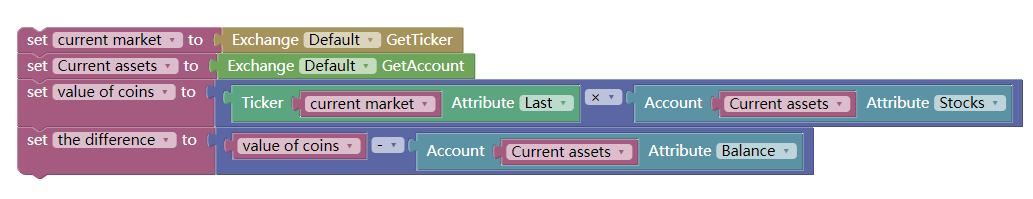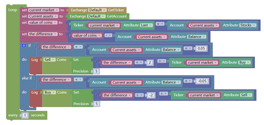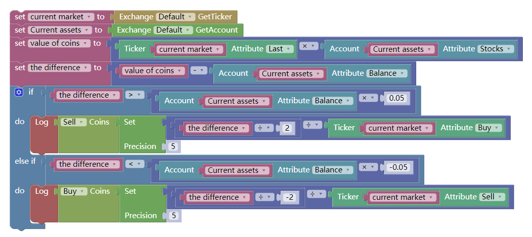 That is, If the current position market value minus the current available balance is less than 5% of the current available balance, open the position to buy. If the current position market value minus the current available balance is greater than 5% of the current available balance, open the position to sell. as shown below: