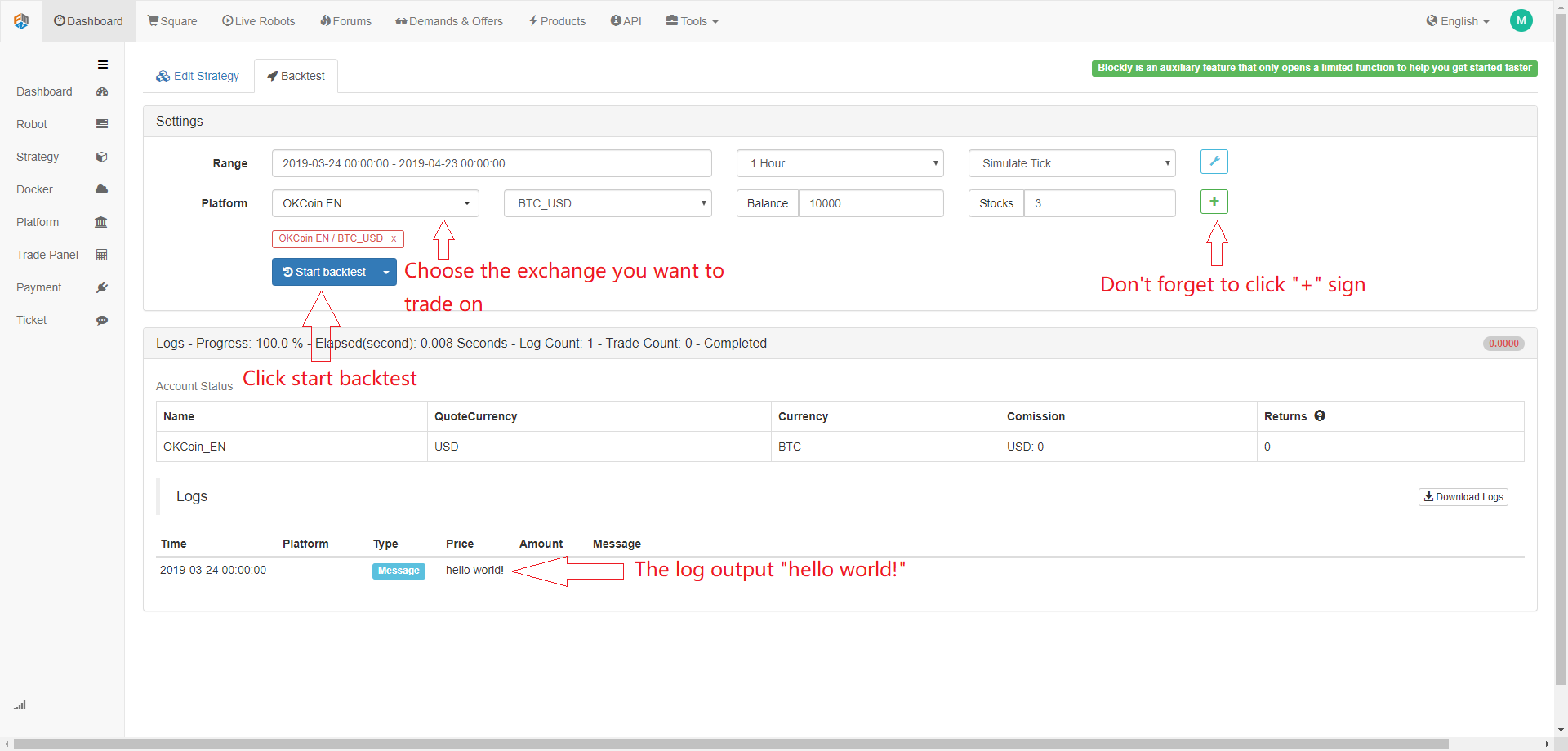 From the beginning of a complete visual programming strategy, to the introduction and characteristics of the visual programing language, we showed you how to use this tool on the FMZ Quant platform, and wrote an example of " hello world ". However, we need to remind everyone that as an step stone to quantitative trading, it currently has only a limited API interface on the FMZ Quant platform. For quantitative trading, it is better to treat it as a tool, which for helping you to sort out the logic of your strategy.