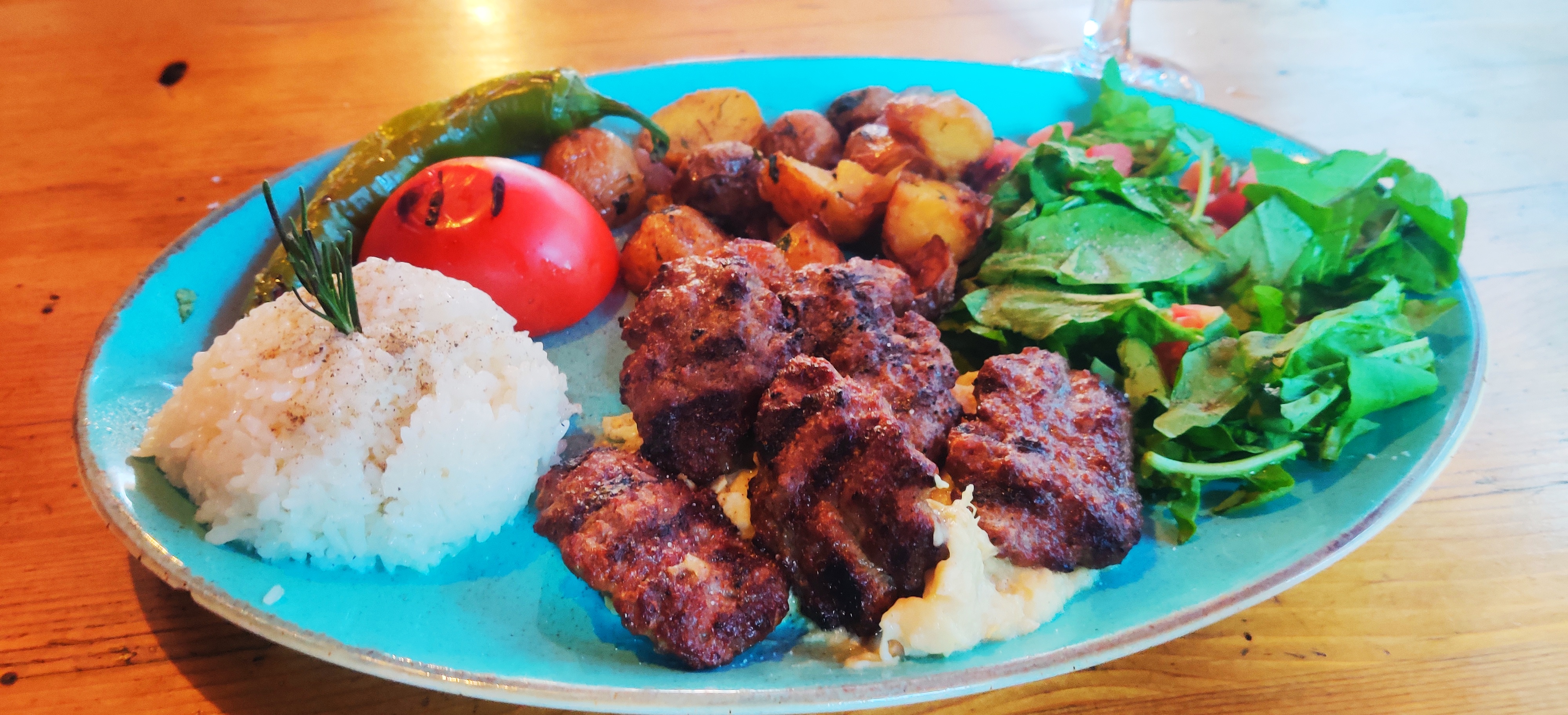 BEĞENDİLİ KÖFTEabbak7 (68)in #food • 4 years ago Grilled meatballs on aubergine pure served with rice, sauté potato and rocket salad with tomato. #steem #steemit #kadikoy