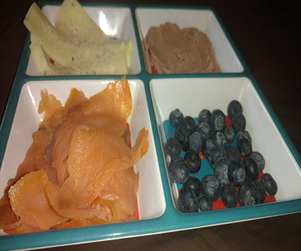 Platters: Fresh rustic baguette slices, paté (for the Mr.), smoked salmon, Havarti cheese, tortilla chips, homemade pico >de gallo, and peak of the season blueberries