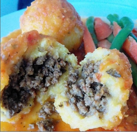 Just knead the cornmeal with a pinch of salt, then form a ball, open a hole and fill with ground meat, cook in boiling water until you see them float and serve bathed in red sauce. How to prepare the sauce? Boil the water and dip 4 ripe tomatoes until the skin is peeled, remove the skin, liquefy the strain and set aside. Sauté half onion, half red pepper and 4 teeth underneath, all cut into small squares. Mix with tomato sauce. Let it boil over low heat, add salt, oregano and a touch of sugar, let it boil until it thickens a little ... Try it and you will love it, they are so soft and pleasant for the palate ...