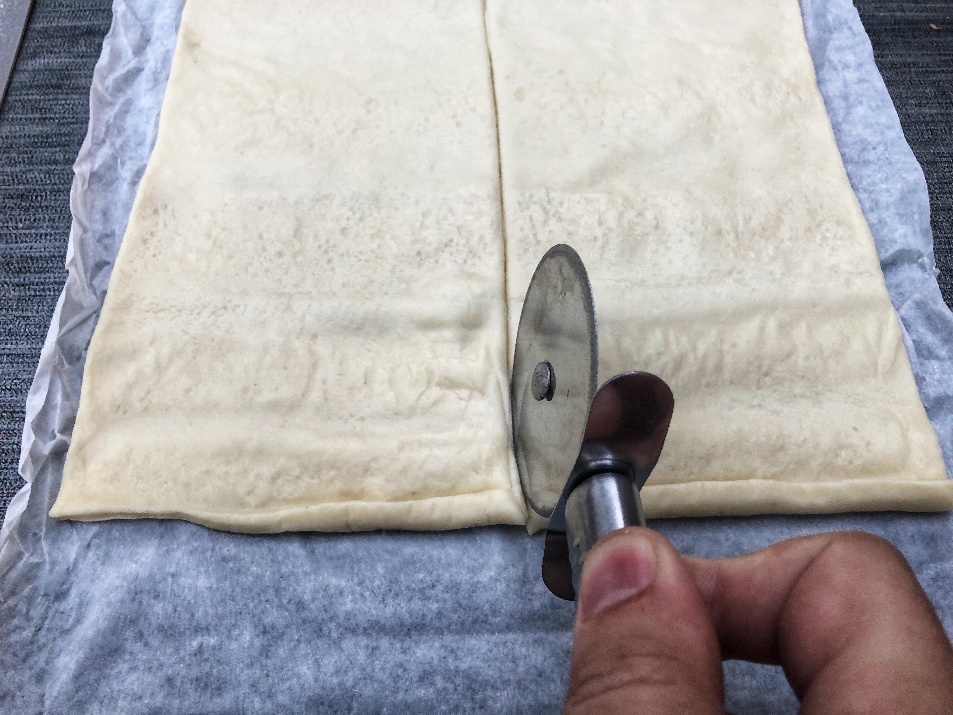 The dough is cut in half so that the surface-grill can bake the whole pizza.
